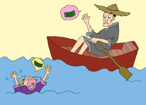 这时附近正好有一艘小船,船上的人说:“好!给我五十元,我就救你。”那个溺水的人却说:“五十元太贵了,给你二十元好了。”船上的人说:“不行、不行!太少了!”这时,河里那个人已经呼吸困难,而且又呛了好几口水,于是他说:“好啦!好啦!那三十元!”船上的人说:“不行,四十元是最底价!”那个溺水的人说:“那我…我宁可淹死!”