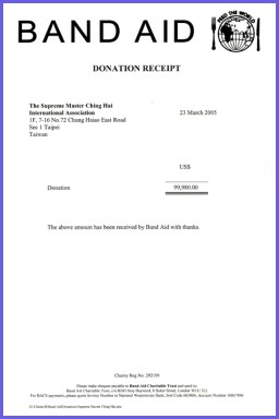 2005年3月,当师父得知“援非联合乐团慈善信托基金”的善举时,立即以她一贯的作风,自动捐赠了10万美金支持该信托基金。就像师父所做的其他种种事情一样,此项随手而为的捐款行动,再次展现师父无私的大爱,以及“施而不施”的精神。