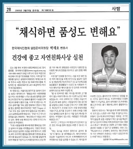 “我开始从事这项工作,是为了让人们知道素食是多么有益,可以为我们的生活带来幸福快乐。过去几年来,素食活动进行的范围,都仅局限在一些志同道合人士所组成的地方团体内,这些团体与活动实在有必要进一步加以组织与规划,以符合韩国素食协会的理想。一旦我们成为正式的非政府组织后,每个月将发行一期杂志,并着手进行研究,好让人们了解素食的种种优点,例如:有益健康、解决世界饥荒、更有效地运用能源、尊重生命、符合社会正义及稳定的食物供应等等。”