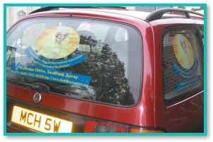 此外,為了將小中心重新開幕的消息廣傳給大眾,我們想到透過同修的汽車來宣傳是不錯的方式。於是我們設計了一款小中心的標誌,上面印著師父美麗的法相和小中心的聯絡資料,可以很方便地展示在車窗上。許多同修在得知利用汽車來分享師父教理非常有效果後,都紛紛向我們索取小中心的標誌。現在每當我們開車經過市區、載小孩上學、停車上班等等,都在推廣師父的教理!