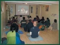 小中心一樓原是錄影帶商店,經過重新整修後,已成為現在的打坐大殿及接待廳。兩個月的整修期間,同修們同心協力,將原本老舊的房舍轉變成美輪美奐、展示著師父畫作與萬歲燈的共修中心。來賓可直接進入前方的接待廳,在這裡觀看師父錄影帶、閱讀師父教理,或與同修討論打坐修行的話題。
