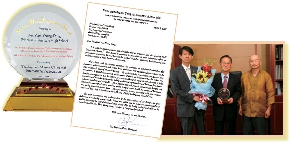 黃金4年(2007年)6月29日,清海無上師世界會將「光耀世界領導獎」頒贈給豐山高中(Pungsan High School)校長允永東先生(Yoon Young-Dong),以表彰他對學生開明的卓越奉獻及推廣素食的愛心引導。他也是首位榮獲這項精美獎牌的韓國人。 豐山高中位於韓國安東市(Andong)的郊區,它之所以成為韓國最好的私立學校之一,主要在於允永東先生的做法很有見地,懂得將學生的最佳特質引導出來;他不但重視學生的學業表現,也關注他們內在的自性發展與智慧。有時允先生還會與學生和教師們留校到很晚,視情況需要用愛心指點及關懷他們。對學生而言,他確實就像慈父一般。 他致力於讓學生了解美德、素食的利益等最崇高的理想,顯示出他對人們身心靈的真正安康,甚至對整個世界,都非常有遠見,也非常關心。他的智慧與愛心將為韓國年輕的菁英及社會大眾帶來無限的利益與福祉。 允先生在獲頒這個獎項後,謙虛地感謝清海無上師的贈獎,他說他會仔細思考這個獎項所代表的意義,並努力從事這份工作,以彌補自己的不足之處。 為了進一步發展學生純真的天性,他也考慮將學校的餐點全部改為素食,並教他們打坐。他相信打坐非常重要,可藉以增進孩子們的注意力、拓展他們未來的視野,並開創美好人生。 允先生認為:「為動物、植物及人類等所有與我們一起居住在地球上的眾生著想,並謙卑地對待他們,是非常重要的。」他對萬物相連相繫的領會,以及致力培育新生代的努力,已樹立了鼓舞人心的正面典範,值得大家效法。