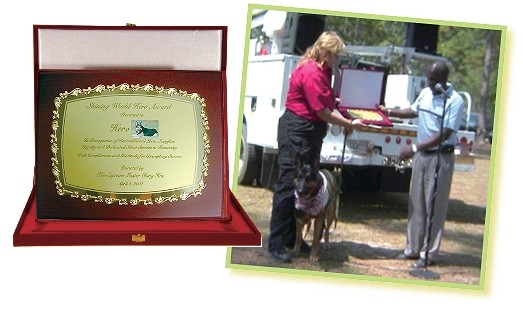 「英雄」,就如同他的暱稱一般,大家都知道他掙脫狗鏈尋訪四周的事情。上回「英雄」因一陣車禍的巨響令他掙脫狗鏈一探究竟;當時雪儂•羅莉亞(Shannon Lorio)在轉彎時車子失去控制,她的車子朝後翻落到人煙罕至、叢林茂密的護欄下,雪儂從後窗被拋出,那時她的腦中一片混亂、全身是傷,人也滾到後車廂上。她說:「鮮血從我的臉上和鼻子流出,突然間我感覺到有個怪物--相當巨大的怪物跨在我身上。我看太多狼人和吸血鬼的恐怖電影,我想他正要吃我。」 雪儂描述有隻狗開始舔她的臉,這隻兩歲大70磅重的狗將她136磅重的身體從車子拉出,雪儂被現在她所暱稱的「英雄」拖行50碼到路邊,讓她能夠向來往車輛求援,雪儂說:「這隻狗將永遠銘記在我內心深處。」 「英雄」原先住在喬治亞州湯瑪士維爾(Thomasville)的「湯瑪士維爾-湯瑪士郡人道救助協會」,後來有50多位人士要求領養他。目前「英雄」是由海蒂•卓地(Heidy Drawdy)與她的先生照顧,他們兩位都是動物訓練員。海蒂說:「『英雄』非常聰明,很少會膽怯害怕。」「英雄」正被訓練為搜救犬。 一場由人道救助協會贊助,慶祝湯瑪士郡「湯瑪士維爾愛犬公園」的開幕剪綵儀式,許多人帶著他們的愛狗前來參與慶祝活動,享受美食、點心和輕鬆愉快、充滿愛心的氣氛。愛犬公園是現有公園的一部分,有圍牆隔離,讓主人能安心地遛狗。 當地新聞媒體也到現場拍攝這個特別的場合,開幕儀式由「湯瑪士維爾-湯瑪士郡人道救助協會」的會長擔任主席,還有當地的消防隊也帶著他們專屬的救援犬出席。各個年齡層的孩子們和不同品種的狗兒快樂嬉戲,享受一個輕鬆愉快的午後。