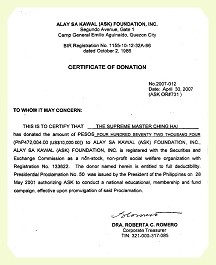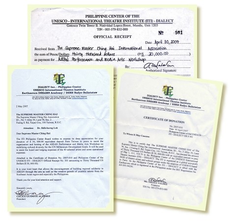 今年二月,菲律賓國際戲劇協會(International Theatre Institute)會長西西莉•吉達特•亞凡瑞茲女士(Cecile Guidote-Alvarez)應邀在西湖道場歡度中國新年期間,很驚訝地發現清海無上師不但是一位靈性導師,而且在藝術方面具有多樣的才華和成就,令她深感佩服,於是寫信給國際戲劇協會在法國巴黎的總部,大力推薦邀請師父參加今年聯合國教科文組織(UNESCO)在巴黎舉行的國際戲劇節盛會。經由她的介紹,許多國際知名的藝術大師認識了師父,很多中東地區的戲劇專家、教授、導演也接受了「無上師電視台」的採訪,將他們高雅的藝術精神與和平理念傳播給世人。(請參閱本刊第178、182期的報導) 與會期間,西西莉女士有緣與師父暢談她的理想,她不但幫助菲律賓本地的一些殘障青年與無家可歸的遊民從事藝術學習,讓他們獲得新生,並且幫助國外有才華的青年前往菲律賓學習藝術。師父得知她的高雅理想後,慨捐三萬美元協助這些追求真善美的人士。師父的慷慨捐助讓西西莉女士非常感動,她特地致函給師父,表達由衷的敬意與謝忱。在信中,她感謝師父捐款給菲律賓國際戲劇協會,並贊助東南亞國協(Association