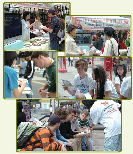 【紐約訊】黃金4年(2007年)7月4日,清海無上師世界會紐約小中心參加了在南街海港(South Street Sea Port)附近舉行的「街坊博覽會」。這個博覽會每年都會在此地舉辦,因為當天會有許多人往這附近聚集,以觀賞夜晚所施放的國慶煙火。今年我們攤位的主題,就是將「無上師電視台」呈現給紐約的民眾。 藉由一個大型的電視螢幕,再搭配強而有力的音響效果,使得幾乎所有經過我們攤位的人,都會情不自禁地轉過頭來面向螢幕,同時看到螢幕上方橫幅上的師父法相。許多人被節目內容吸引而駐足在電視前面觀賞,有的人更停留很長一段時間方才離去。 我們獲得許多對節目的讚揚,人們尤其感謝我們「只播送肯定正面的新聞」。得知大多數的人也渴望建立一個更美好的世界,並由抱持肯定的態度開始做起,不禁使人信心大增。 我們也在會場分送出不少「無上師電視台」的傳單。感謝師父加持,讓我們擁有一個非常圓滿成功的博覽會。