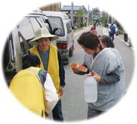 第二组同修于27日前往受灾最严重的小千谷市。由于山区道路柔肠寸断,同修一开始无计可施,但在师父加持下,很快打听到道路与村庄的消息,因而顺利前往川井地区的四个村落。这些村落的居民眼见山中的道路断裂,纷纷提供自己的田地,打造出迂回的临时道路,使得救援物资得以顺利送达。28日,同修采购了手电筒、电池、甜食等物资,加上店家免费提供的20条新毛毯,前往岩泽地区的三个小村落。此地的居民几乎都已前往亲戚朋友家避难,留下的全是不愿离开社区的老人。当同修致赠物资给他们时,他们都十分高兴。在离开山区的回程中,尽管路况不熟,但总会及时出现替同修带路的人,真是不可思议。29日,同修得知附近的吉谷小村庄受灾十分严重,便火速前往。经过访查,得知灾民所需的物品后,同修随即采购了手电筒、电池、水果、饭团、小炉具等物品,此外,上次免费提供毛毯的店家又再次免费提供毛毯和餐具。灾民们收到这些物资时,都感到欣喜万分。