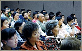 当天的讲座,首先播放师父的讲经录影带《终止战争的方法》,师父精采的开示,让来宾们听得兴致盎然,会场充满庄严神圣的气氛。问答时间,与会来宾对佛教、打坐、解脱等方面特别关注,提出许多相关的问题。随后有许多来宾学习方便法,其中有些人平时已有吃素的习惯,对宗教信仰相当热中,有的来宾则曾修过其他法门,如今他们都想透过修习方便法,使自己的身心灵更加净化与提升。