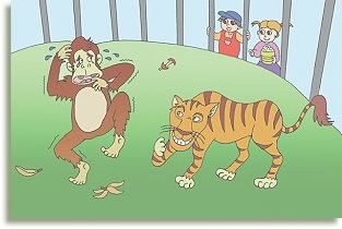 有一天,那隻假猩猩吊在樹上玩得過度,一不小心掉進隔壁的柵欄裡,沒想到那裡住的是一隻老虎。老虎吼很大聲跑過來,假猩猩嚇得一直後退、一直後退。老虎卻一直逼到他面前,盯著他直看,那隻假猩猩發抖到快昏倒了!這時,那隻老虎才說:「別怕!我也是假的。」