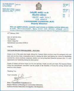 我們隨後探訪了位於卡爾穆奈(Kalmunai)的伊斯蘭馬巴德及馬爾都穆奈(Mardomunai)兩處災區,並為災民搭建帳篷。接著又走訪了兩所學校、一座清真寺和一處救難營,發放帳篷、廚具、藥品、餅乾、雨衣等物資。