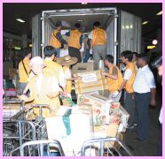 1月15日黎明前,救援隊抵達可倫坡機場。穿著清海無上師世界會黃背心的師兄師姊,在機場領取託運的物資時,受到斯里蘭卡國家電視台記者的矚目,電視台隨後透過五個頻道,報導世界會此次的賑災之行。