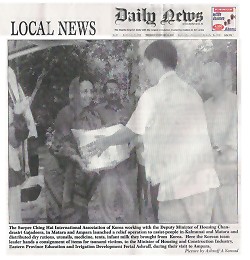 清海無上師世界會韓國救援隊,會同斯里蘭卡住屋營建部副部長全德拉喜瑞•加爵迪拉(Chandrasiri Gajadeera),在馬塔拉(Matara)及安帕拉(Ampara)展開賑災工作,援助卡爾穆奈(Kalmunai)與馬塔拉的災民,救援隊將購自韓國的乾糧、用具、藥品、帳篷及嬰兒奶粉等物資分送給災民。圖為韓國救援隊探訪安帕拉時,隊長將世界會準備援助海嘯災民的物資遞交給住屋營建暨東部教育和灌溉開發部長菲利爾•艾許拉夫(Ferial