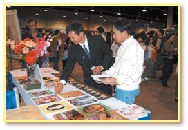 同修的攤位設於人潮川流不息的大廳內,攤位上陳列的師父大法相,以及畫作、萬歲燈等美不勝收的藝術創作,都備受來賓矚目。一位男士非常讚賞典雅的萬歲燈,詢問是否可以請購。來賓參觀我們攤位時,都欣然拿取免費贈閱的素食食譜、樣書與新聞雜誌。