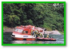 [Reporter Hsieh Wu-hsiung, Fuhsing] The Chinese Amphibious Rescue Association formed by a local civic group held its official inaugural ceremony under the Lofu Bridge in Fuhsing rural township yesterday. For this occasion, members of the Association performed a series of waterborne rescue exercises, many of which called for the use of difficult techniques such as vertical helicopter landing and rubber dinghy maneuvering through rapid waters to save people. Their brilliant performance greatly impressed many people frolicking in the nearby water.