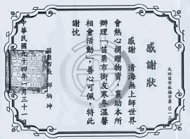 Certificate of Appreciation from the Mayor of Miaoli City to The Supreme Master Ching Hai International Association for its love and care for homeless people