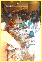 On Saturday April 1, Golden Year 3 (2006), Hong Kong Center held an exhibition with the title, “The Noble Art of Vegetarian Alternative Living”, in Xi Wan He Cultural Center attracting almost a thousand visitors. The exhibition combined Master’s art creations with vegetarianism and thus, presented the theme message of “Alternative Living” in an innovative way and fully demonstrated the beauty and the nobility of the vegetarian lifestyle. When the director of the Xi Wan He Cultural Center heard that the initiates were from a nonprofit organization wanting to promote vegetarianism, he was very supportive. It was he who suggested adding “The Noble Art of Vegetarian” to the title, thus linking the Alternative Living message with the art exhibition. What’s more, he offered a 35% discount on the rental fee of the hall. The exhibition hall was decorated beautifully under the attentive arrangement of the fellow initiates. The first exhibition area displayed nine of Master’s Longevity lamps, which radiated graceful gentle lights at the entrance. Next were Master’s paintings revealing traces of the spiritual journey, with 15 paintings on display, such as “Filled with Grace”, “Heavenly Flowers”, “Peaceful Time” and “Independent”. In addition, Master’s spiritual publications, poems, hard covered introductory books for Celestial Clothes and Jewelry, as well as other crafts were also on show. In front of each exhibition area, initiates were assigned to explain the meaning of the art works to interested visitors. The last area was for promoting vegetarianism. Along with 2 large size Alternative Living posters, pictures of common vegetables and fruits, more than 10 vegetarian cooking books, and fresh fruits and vegetables were also displayed in a creative way. The whole arrangement emphasized the theme “Alternative Living”. A lady took the trouble to stay in line twice in order to sample the food. She told an initiate, “These dishes are so delicious that I want to try them again. I know that eating meat is not good because we have to pay for the karma. From now on, I will cook vegetarian food for my family.” Initiates also offered free vegetarian recipes and information on the stores that sell vegetarian ingredients. Before the guests departed, initiates