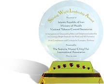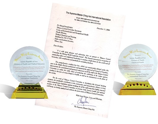 On the evening of May 30, Golden Year 4 (2007), the night before the International Anti-Smoking Day convention, TV reporters and government officers gathered at the Ministry office of the Health department of Iran to witness the Supreme Master Ching Hai International Association presenting the “Shining World Leadership Award” to the Islamic Republic of Iran Ministry of Health and to the Deputy of Health. This Award is presented in recognition of outstanding effort and enlightened leadership to achieve a comprehensive smoking ban law. The ceremony began with the playing of a 16 minute DVD to introduce the origin and purpose of the “Shining World Leadership Award” and some famous Award receivers. The Deputy Minister of Health Dr. Alavian accepted the award and expressed his gratitude for receiving the award from Supreme Master Ching Hai. In his speech Dr. Alavian pointed out: “Prophet Mohammad mentioned that security and health are the two most important issues to the population. I thought this is common in other religions as well.” “We love our children; we love our neighbors’ children as well. We love our population’s children. So this is why we recommend to all parents to stop smoking in the family. We don’t like to see any danger or any harm to the people because we believe that they are from God.” On the evening of May 31, Golden Year 4 (2007), around 1,000 people gathered at the auditorium of Shahid-Beheshti University of Medical Science in beautiful Tehran, Iran, to participate in the International Anti-Smoking Day convention. The participants came from diverse backgrounds - WHO (World Health Organization) delegates, cooperation representatives, Health Department staff from the Municipality of Tehran, professors, students, teachers, and many citizens. The event was organized by the Islamic Republic of Iran’s Ministry of Health supported by 13 non-governmental organizations (NGOs).