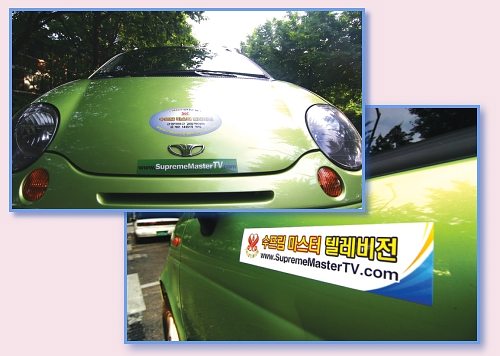 Korean fellow initiates have put Supreme Master Television stickers on their cars to promote it.