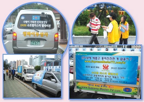 Busan fellow initiates carry out car parades with the Supreme Master Television message around downtown and the beach area, and also distribute Supreme Master Television flyers to Busan citizens.