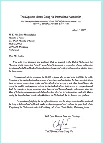Mrs. Jeannette Van der Kloet, Head of Protocol for the Ministry of Justice, accepted the Award on behalf of Minister Hirsch Ballin. She expressed that Minister Hirsch Ballin was very grateful for the Award and happily surprised that people outside his country noticed the actions of the Dutch Government. When asked about the application process for amnesty permits and how the refugees will be cared for, Mrs. Van der Kloet replied that it includes a naturalisation course for all asylum seekers. This will help them adapt to the Dutch culture and western way of living, providing them with the counselling they need to begin a better life. The government has allocated 55 million Euros to implement the amnesty regulation.