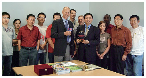 Supreme Master Ching Hai honored Professor Max Lu and his research team with the Shining World Inventor Award for developing this innovative method of acquiring solar energy and for adapting it to water and air purification in everyday use. Our Association members from Brisbane presented the beautiful plaque and some of Master’s latest publications, DVDs and CDs to Professor Lu and his team, on behalf of Supreme Master Ching Hai, at the University of Queensland, on December 19, Golden Year 5 (2008). The Professor was extremely grateful for the Award and gifts saying, “Please thank Supreme Master Ching Hai. I really appreciate this recognition. Thank you.”