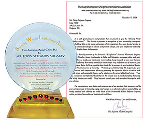 In recognition of his outstanding, courageous efforts shedding light on the many advantages of the plant-based diet, Supreme Master Ching Hai honored Mr. Edvin Sugarev with the Shining World Leadership Award, which our Association members presented to him on November 17, Golden Year 6 (2009).