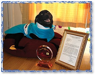 For his great intelligence and courage, Supreme Master Ching Hai granted Toby the Shining World Hero Award. On August 6, Golden Year 6 (2009), our Association members presented Toby the beautiful Award plaque, along with many gifts from Master that included a Happy Doggie coat, a bed and £500 for veggie food and treats. His caregivers also received a selection of Master’s books and DVDs with some vegan chocolates. We join in saluting heroic Toby for his
