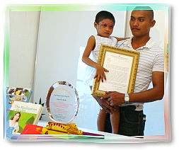 On April 15, Golden Year 7 (2010), when our Association members visited little Virginia at a shelter, they were immediately taken by this sweet girl who hugged and kissed them like they were her family members. She appreciated all the vegan foods and toys brought to her and kissed Master’s photo affectionately. In addition to the Award plaque, Master also contributed US$2,000 to aid in Virginia’s recovery. More presents included a Heroine T-Shirt plus Master’s DVD’s and books. Virginia and her family were filled