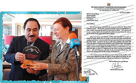 On May 18, our Association member presented Dr. Nayef Al-Fayez, Jordanian Minister of Health, the Award, the accompanying letter from Master, a selection of Her books, DVDs and CD’s as well as some chocolates, in the Groud Hotel Kempinski in Geneva. The Jordanian Ambassador to the United Nations and several other officials were also in attendance. Dr. Al-Fayez was very pleased and expressed his warm gratitude, adding that Jordan is also going to ban smoking on buses and trains. Our appreciation, Jordan and Iraq, for