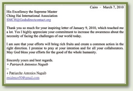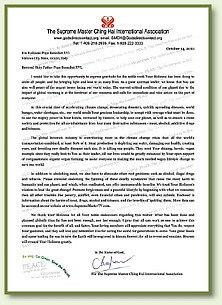 Out of Her deep concern for the fate of humanity, Supreme Master Ching Hai sent personal letters to world political leaders (please refer to Magazine #205 for details) and religious leaders to inform them of the current urgent state of global warming and to call on their “open support of compassionate organic vegan farming, to assist everyone in making the much needed vegan lifestyle change to save our world.”