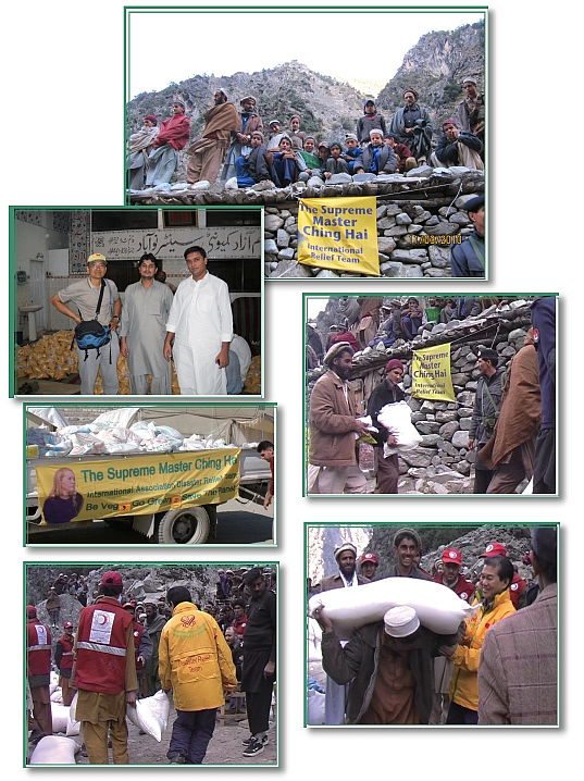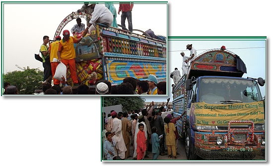 (Originally in English and Chinese) In mid-February 2010, heavy snowfall and avalanches hit the northern province of Pakistan, burying houses under thick snow. The access roads were blocked, thus cutting off the food supply to the affected areas. Three months later, continuous heavy rainfall and landslides struck the Hunza region, causing rivers to rise to a dangerous level. The government expanded their evacuation efforts, relocating some 45,000 local residents to 20 shelters around Hunza. Supreme Master Ching Hai immediately responded to the disastrous events by providing a total of US$30,000 in financial aid and sending our Association members from Singapore and Formosa to the affected areas. On both occasions, the much needed food supplies were delivered to the hands of the destitute people with the help of the local NGOs, the Red Crescent Society and All Green Pakistan. However, at the end of July, torrential rains caused massive flooding of the Bann River in Balochistan Province, the worst in more than 80 years. This was followed by a second wave of floods on August 14 around the Indus River in Sindh Province. In addition to hundreds of mud houses being swept away, government buildings, local businesses, schools and bridges were also destroyed along with thousands of acres of crops. More than 1,600 people lost their lives and over 20 million survivors have been rendered homeless and in desperate need of aid. Pakistani governments, countries worldwide as well as aid groups have been responding diligently despite vast difficulties in delivering supplies and reaching stranded villagers, with one of the most impacted regions being the Naushahro Feroze District in Sindh Province.