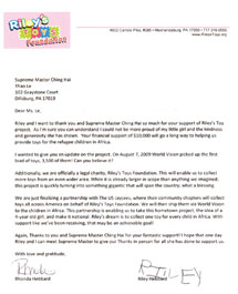 Starting with one preschooler, a difference was being made—through Riley’s Toys for Darfur, which generated a huge response in her community. They have received contributions from Riley’s school and neighborhood friends, former teachers and people who read the story in the paper. In addition, the media have also been helping to spread the good news of these wonderful deeds. Radio station BOB 94.9 invited Riley to share her heart-warming story with their audience. When asked why she wanted to send toys to the children in the refugee camps in Darfur, she said, “Because they didn’t have any toys and then it wouldn’t be fair if I got all of them.”