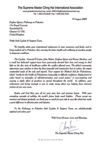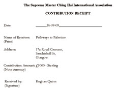 In recognition of their remarkable and altruistic endeavor, Supreme Master Ching Hai sent a US$15,000 contribution and a Letter of Salute to the caring cyclists, in which She wrote, “The global community appreciates your wisdom that shows by direct, peaceful and constructive love in action to meet the urgent unattended needs of the sick and injured . . . . In addition, your enthusiasm and loving example are sure to make many others act, helping these innocent victims of war even more.”