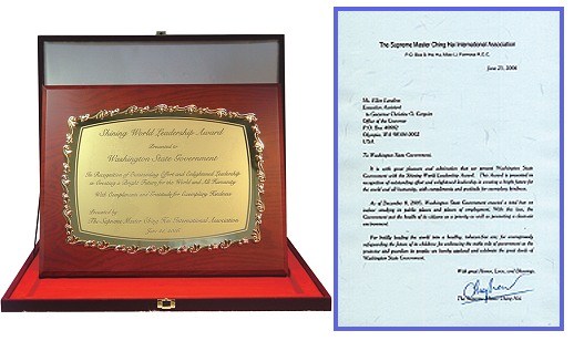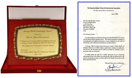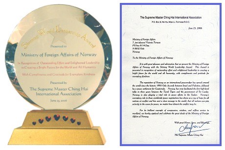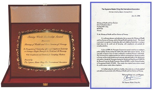Penghargaan Kepemimpinan Cemerlang di Dunia Pada beberapa bulan yang lalu, pemerintah negara bagian Washington dan Rhode Island, dan juga Menteri Layanan Perawatan dan Kesehatan Norwegia telah menerima plakat Penghargaan Kepemimpinan Cemerlang di Dunia (Shining World Leaderhsip Award) dan piagam. Penghargaan ini untuk menghormati mereka atas upaya mereka membawa dunia ini ke era yang lebih sehat, bebas rokok dan membuat kesehatan para penduduknya sebagai prioritas utama dan juga mempromosikan lingkungan udara yang bersih. Menteri Luar Negeri Norwegia juga menerima plakat penghargaan dan piagam sebagai pengakuan atas usahanya yang luar biasa dan kepemimpinan yang tercerahkan dalam menciptakan masa depan cemerlang bagi dunia dan seluruh umat manusia, dengan rasa hormat dan terima kasih atas kebaikan yang penuh teladan.
