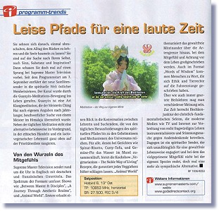 Jalur Sunyi di Era Hiruk-Pikuk Apakah Anda ingin santai, kembali ke keseharian Anda dan biarkan jiwa Anda bebas? Apakah Anda sedang mencari jati diri, demi suatu makna, demi suatu substansi dan inspirasi? Jika demikian halnya, cobalah lihat Supreme Master Television. Sejak dimulainya program televisi tersebut pada tanggal 7 September, saluran-satelit baru ini telah membuka cakrawala baru dunia kerohaniaan yang berasal dari kebijaksanaan timur. Saluran ini menayangkan praktik Meditasi Quan Yin. Quan Yin adalah suatu jenis Meditasi Suara yang diturunkan oleh Guru Ching Hai setelah Beliau melakukan pencarian yang panjang dan sulit untuk menemukan seorang Guru di Pegunungan Himalaya. Praktik tersebut fokus pada meditasi setiap hari, juga pilihan gaya hidup yang menekankan perbuatan susila dan pola makan lakto-vegetarian. Akar Kasih Sayang Supreme Master Television ditayangkan sepanjang waktu dalam bahasa Inggris dengan teks terjemahan dalam bahasa Jerman dan Prancis. Lingkup tayangannya mencakup “Antara Guru dan Murid”, “Perjalanan Melalui Alam Estetis”, dan “Dunia Satwa”. Tayangan “Antara Guru dan Murid” memberikan sekilas percakapan antara Guru dengan para pencari Kebenaran, mulai dari tantangan setiap hari dalam jalur kerohanian hingga rahasia dan cara kerja alam semesta. Siapa pun yang suka dengan masakan yang bernama Risol Bayam, Tahu Kari, dan Pai Sayur, tentu akan puas dengan tayangan memasak, “Vegetarisme – Jalan Hidup Mulia”. Resep makanan lezat akan menaikkan detak jantung semua vegetarian. “Dunia Satwa” menampilkan koeksistensi dari berbagai spesies di planet kita dalam lingkungan yang penuh kasih sayang dan penghargaan terhadap kehidupan. “Kata-Kata Bijak” menyajikan ceramah penuh wawasan dan diskusi oleh Maha Guru Ching Hai, baik yang berhubungan dengan hal-hal yang praktis maupun kerohanian. Acara televisi rohani yang mengusung pesan 'tanpa kekerasan' dan 'penuh kasih sayang' ini telah menjangkau jauh di balik keberadaan kita sendiri dan menjadi pilihan acara yang amat menyegarkan.