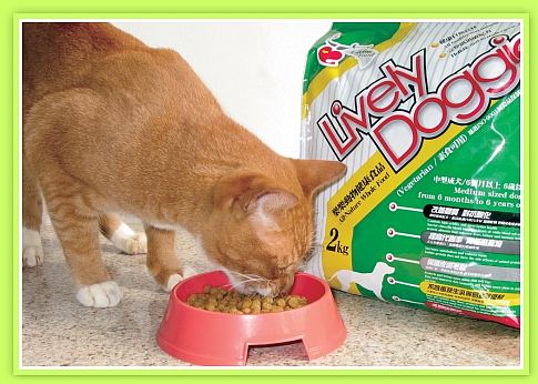 Beberapa tahun yang lalu, kami mengadopsi seekor anak kucing dari Perkumpulan Pelindung Binatang. Pada mulanya, kami mengira bahwa gigi dan sistem pencernaan kucing tidak cocok untuk makanan vegetarian. Jadi, kami menerima nasihat dokter hewan dan memberi makanan nonvegetarian kepada anak kucing itu. Mungkin karena diet dagingnya, anak kucing kami mudah marah dan suka mencakar orang setiap kali dia merasa terganggu. Ia bahkan sering mencakar tangan dan kaki kami. Belakangan, kami memasukkan makanan vegetarian yang sederhana seperti roti dan rumput laut yang sudah direndam ke dalam makanannya. Sangat mengherankan, anak kucing itu menyukai makanan itu. Perlahan-lahan dia menjadi lebih sehat dan kuat, dan sifatnya menjadi lebih jinak dan lembut. Dia bahkan tidak akan memburu serangga kecil dan jarang mencakar kami. Sekarang kucing kami berumur enam tahun. Sepanjang tahun-tahun tersebut, dia tidak pernah pergi ke dokter hewan. Dia mempunyai kamar sendiri dan sebagai ganti bak pasir, dia memiliki kloset yang mudah dibersihkan di sebelah kloset jongkok kami.. Sejak Loving Food memproduksi ‘Food for the Lively Doggie (Makanan untuk Anjing yang Gesit)’, kucing kami menikmati makanan baru yang lebih bergizi dibanding roti dan rumput laut. Belakangan ini, kucing kami menjadi lebih gesit, ototnya lebih kuat, dan bulunya lebih mengkilap. Bersin yang sekali-kali terjadi karena alergi juga telah berhenti.