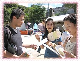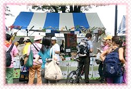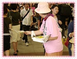 Suhu yang tinggi menjadikan kipas “Cara Hidup Alternatif” paling disukai di antara para pengunjung, yang menciptakan pemandangan indah dari kupu-kupu yang menari pada saat kipas-kipas digerakkan dan dikibaskan di udara bersama-sama. Para pengunjung tertarik ke stan kami, dengan tawaran kue sayuran kukus, teh susu kacang, dan kue keberuntungan. Di antara para tamu terdapat pemilik sebuah restoran vegetarian di Prefektur Wakayama. Dia merasa sangat tersentuh setelah membaca brosur “Cara Hidup Alternatif” di sebuah restoran vegetarian di Kyoto, dan dari sana dia mengambil setumpuk untuk dibagikan di restorannya sendiri. Setelah bertanya tentang kelompok kami dan kegiatan promosi “Cara Hidup Alternatif”, dia sangat tergerak untuk bergabung dengan kegiatan kami di waktu mendatang. Dia juga ingin membeli kipas “Cara Hidup Alternatif” dan kaus dan memajang brosur “Cara Hidup Alternatif” di restorannya. Pada hari kedua dari acara tersebut, kami membagikan sejumlah besar brosur “Cara Hidup Alternatif” di stasiun kereta api Kyoto, di jalan-jalan yang ramai, dan di daerah permukiman.