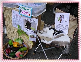 Di antara para anggota pada stan pameran kami, yang paling menarik perhatian adalah Toki, seekor kucing vegetarian yang diselamatkan dan diadopsi oleh sepasang inisiat. Toki mempunyai bulu yang bersinar, badan yang bulat, dan juga sikap yang lembut dan jinak yang memancarkan aura yang nyaman. Dia mendapatkan tepukan dan pelukan dari orang-orang. Ini adalah gambaran yang sempurna tentang bagaimana manusia dan hewan seharusnya hidup bersama dalam keharmonisan.