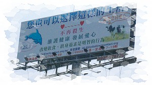 Center Changhua telah menyewa sebuah papan iklan di daerah yang berdekatan dengan jalan bebas hambatan untuk menampilkan pesan ‘Cara Hidup Alternatif’. Ketika bernegosiasi dengan agen periklanan, kami sambil lalu mendapati bahwa pemilik agen tersebut juga seorang vegetarian. Dia sangat mendukung usaha kami untuk mempromosikan pola makan vegetarian dan menawarkan nilai sewa papan iklan dengan diskon hampir 40 persen. Sekarang, papan iklan besar yang menampilkan gambar hewan yang indah telah berdiri di tepi jalan bebas hambatan. Ia bahkan tampak lebih menonjol ketika diterangi oleh lampu sorot yang terang di malam hari. Para inisiat sangat gembira dan sangat berterima kasih.
