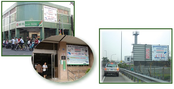 Sebagai kelanjutan dari distribusi besar-besaran barang-barang promosi ‘Cara Hidup Alternatif’ seperti selebaran, kipas, map dokumen; Center Nantou telah menyewa papan iklan ‘Cara Hidup Alternatif’ dari poster tahan air yang besar dengan penampilan yang mencolok untuk jangka panjang. Poster ini ditempel di sepanjang persimpangan jalan bebas hambatan dan jalan-jalan sibuk lainnya. Kami juga telah menyewa papan pengumuman dan dinding luar kantor pos untuk menampilkan poster. Di tempat-tempat ini ada aliran pengunjung yang tetap sehingga sangat efektif untuk tujuan promosi.