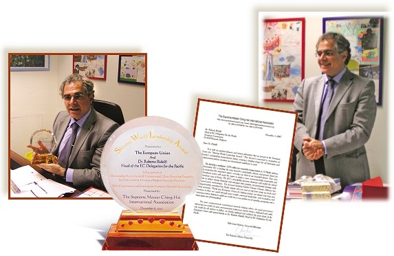 황금시대 4년(2007년) 12월 12일, 벨기에 동수들은 브뤼셀에서 ‘유럽연합 집행위원회 태평양지구 대표단(European Commission’s Delegation for the Pacific)’ 단장 로베르토 리돌피(Roberto Ridolfi) 박사를 만나는 영광을 갖고 칭하이 무상사를 대신해 그에게 ‘빛나는 세계 지도자상’을 수여함으로써 태평양 연안 국가들에 대한 유럽연합(European Union)의 훌륭한 인도주의적 업적을 표창했다. 유럽연합은 13개 태평양 연안 국가의 재생에너지 프로젝트를 위해 2억 7천 6백만 유로를 기부했다. 이들 국가는 지구 총 면적의 1/3을 차지한다. 유럽연합은 환경 보호를 위해 개발도상국과 부를 나눔으로써 아낌없이 돕는 고귀한 모범을 보여 줌과 동시에 우리 행성 전체를 이롭게 했다. 리돌피 박사는 남태평양 지역에 환경 정책을 수립하도록 도운 유럽연합의 성과에 대해 열렬하게 이야기하면서, 자신이 이런 일에 참가하게 되어 행복하다고 말했다. 그는 이 상을 받게 된 것을 매우 기뻐하고 영광스러워하며 자기 비서 두 명을 사무실로 불러 보여 주기까지 했다. 그는 이 영광을 동료들과 함께 나눌 것이며 사무실에서 특별한 자리를 마련해 상패를 놓아두겠다고 말했다.