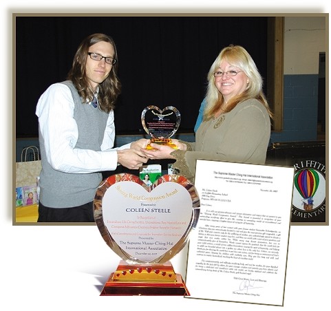 시상식은 스틸 여사의 학교에서 진행되었다. 전교생이 모인 자리에서 아이들은 미술 선생님이 스승님으로부터 ‘빛나는 세계 자비상’을 받는다는 소식을 듣고 박수를 치며 환호했다. 스틸 여사는 상패 외에 미화 천 달러 수표와 스승님의 책과 채식 케이크, 초콜릿 등의 선물도 함께 받았다. 시상식이 있은 후, 미국에서 가장 인기 있고 널리 방송되는 TV 채널 중의 하나인 ‘폭스 뉴스(Fox News)’에서 스틸 여사와 사만사를 인터뷰했다. 스틸 여사는 처음에 그 상을 받게 되었다는 소식을 들었을 땐 믿기 어려웠으나 스승님의 편지를 받고 시상단이 도착하자 믿게 되었다고 말했다. 그녀는 또한 천 달러 수표가 때마침 들어왔다고 말했다. 그녀의 아버지가 암으로 위중한데도 돈이 없어 캘리포니아로 아버지를 뵈러 가지 못하고 있었기 때문이다. 스승님이 주신 수표는 그녀의 여행 비용을 지불하고도 남았다! ‘폭스 뉴스’ 기자들은 이전까지 칭하이 무상사에 대해 들어 본 적이 없었지만 ‘수프림 마스터 텔레비전’ 촬영 팀과 이야기를 나누고 동수들과 인터뷰를 하고 나서는 스승님의 활동과 ‘수프림 마스터 텔레비전’에 대해 깊은 인상을 받았다. 시상식이 있은 지 며칠 후, 스승님은 스틸 여사의 아버지 치료에 도움을 주기 위해 미화 5백 달러를 보내셨다. 스틸 여사네 가족에게는 정말 즐거운 크리스마스가 되었으며, 이는 또한 크리스마스가 사랑의 선물을 보내는 철임을 사람들에게 완벽하게 상기시켜 주었다.