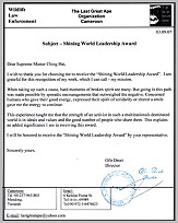 영국의 협회 회원들은 LAGA에 ‘빛나는 세계 지도자상’ 상패를 전달하기 위해 이스라엘로 갔다. 드로리 씨는 바쁜 일정으로 수상식에 참석하지 못하지만 어머니에게 대신 상을 전달해 달라고 요청했다. 이에 황금시대 4년 10월 29일, 협회 대표단은 캐시 드로리(Kathy Drori) 여사에게 상패를 전달했다. 오피르 씨에 따르면 자기 어머니는 영적인 분이며 그에게 이 일을 하도록 힘을 주신다고 준다고 한다. 드로리 여사는 아들을 대신해서 이 아름다운 상을 받고 기쁘고 영광스러운 나머지 눈물을 글썽이며 말했다. “제 아들의 노력과 고생을 인정해 주신 칭하이 무상사님께 감사드립니다.” 동물의 생명을 구하려는 드로리 씨와 LAGA의 노고에 천국의 모든 지원이 함께하길 있길 기원한다. 참조: