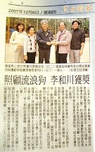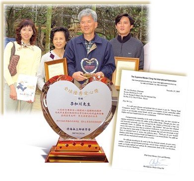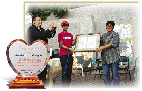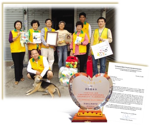 포모사 사람들이 동물 보호에 점점 더 높은 관심을 기울이고 있다. 동물의 복지를 보장하기 위한 단체들이 결성되고, 개인적으로도 많은 사람들이 떠돌이 동물들을 돕는 데 한몫을 하고 있다. (관련 기사는 192호 뉴스잡지를 참고하세요.) 이들의 고귀한 노력을 표창하기 위해 칭하이 무상사 국제협회 대표들은 황금시대 4년(2007년) 12월, 스승님을 대신해 이 인정 많은 사람들에게 ‘빛나는 세계 자비상’을 수여하고 여러 가지 선물을 전달했다. 영광스런 수상자는 허우샹청(侯祥城)·린메이링(林?玲) 부부와 리허촨(李和川) 씨, 황추구이(黃秋桂) 씨이다. 자동차를 집 삼아 밤낮으로 떠돌이 동물들을 돌보다