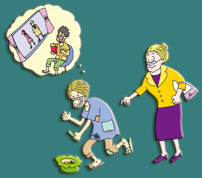 한 남자가 길거리에서 모자를 앞에 놓아두고 “장님임. 제발 도와주세요!”라고 적어 놓고 구걸하고 있었어요. 그 모습을 보고 한 부인이 모자 안에 1달러를 줬지요. 그런데 바람이 세게 불어서 돈이 날아가 버리자 그 남자는 벌떡 일어나 달려가서 돈을 주워 주머니에 넣었습니다. 그래서 그 부인이 말했지요. “‘장님임. 제발 도와주세요!’라고 써 있더니 장님이 아니었군요!” “예, 맞아요. 저는 아니에요. 전 거지가 아니에요. 제 형이 그렇지요.” 그래서 그녀가 물었지요. “그럼 당신은 여기서 뭐 하는 거죠?” 그는 이렇게 말했습니다. “예, 그냥 형 대신 잠깐 앉아 있는 거예요.” 그 부인이 물었습니다. “그럼 형은 지금 어디 있죠?” 그러자 그는 이렇게 대답했어요. “아, 형은 영화 보러 갔어요.”