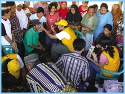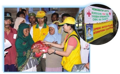 2007년 11월 25일, 인도네시아 숨바와(Sumbawa) 섬에서 리히터 규모 6.5의 지진이 발생해 수십 명의사상자와 부상자가 발생하고 27개 마을 3만여 명 주민들의 삶에 큰 변동을 가져왔다. 이재민들을 걱정하신 스승님은 즉시 미화 5천 달러를 보내 구호 작업에 보태라고 하셨다. 자카르타와 발리 센터 동수들은 신속하게 구호 팀을 만들었다. 그중에는 의사 두 명도 포함되어 있었다. 우리는 기부금을 가지고 12월 4일 숨바와의 비마(Bima) 시로 날아갔다. 구호 팀은 도착한 후 쌀 4,000kg, 라면 300상자, 방수포 100장을 구입해 도움이 가장 필요한 지역인 돔푸(Dompu) 시 적십자 센터로 가져갔다. 적십자사에서 다른 피해 지역에 관한 정보를 수집하고 다음날 전달하기 쉽게 구호 물자를 작은 소형 꾸러미로 포장했다. 12월 5일과 6일, 적십자사 회원과 자원 봉사자, 경찰, 그리고 구급차 한 대와 적십자 차량 세 대와 함께 동수들은 일곱 마을을 다니며 트럭 두 대에 가득 실린 구호품을 나누어 주었다. 구호 팀은 음식과 생활용품을 나눠 주는 것 외에 이재민들에게 절실히 필요한 무료 진료도 실시했다. 또한 킬로(Kilo) 읍에 있는 한 학교를 보수하기 위해서 적십자사를 통해 시멘트 200포를 전달했다.