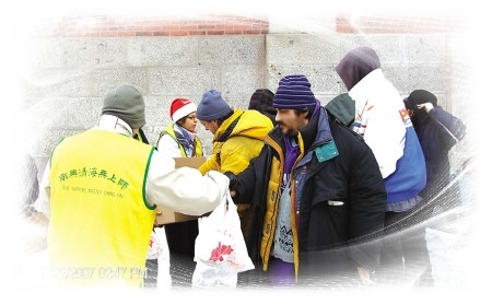이번 휴가 기간 동안에 나눔의 정신으로 함께 모인 캐나다 몬트리올 협회 회원들은 노숙자들과 스승님의 사랑을 나누었다. 황금시대 4년(2007년) 12월 22일 토요일, 몬트리올 센터는 신선한 샌드위치와 선물 가방을 준비했다. 각 가방마다 맛있고 영양 있는 채식 샌드위치와 주스, 초콜릿, 웨이퍼, 과일 등이 들어 있었다. 동수들은 시내에 있는 노숙자 보호 시설인 ‘아버지의 집(La Maison du Pere)’을 방문했다. 그곳에 있던 노숙자들이 아주 기뻐하며 선물을 받았다. ‘어떤 단체가 밖에서 크리스마스 선물을 나눠 주고 있다’는 소식은 빠르게 퍼졌다. 야간 침상을 배정받으려고 줄 서 있던 노숙자들은 그 소식을 듣자마자 동수들에게로 달려왔다. 눈 깜짝할 사이에 모든 선물이 동이 났다. 주는 쪽이나 받는 쪽 모두 행복해했다. 어떤 이들은 정말 필요하던 참에 선물이 때맞추어 왔다고 말했다. 그때 우리는 스승님께서 이 즐거운 휴가철에 직접 선물을 가져다주시며 그들을 위로하시는 듯한 느낌이 들었다. 우리에게 진정한 크리스마스 정신을 일깨워 주신 스승님께 감사드린다. 칭하이 무상사와 국제협회의 인도주의 구호 활동을 보시려면 다음 사이트를 방문해 주세요.