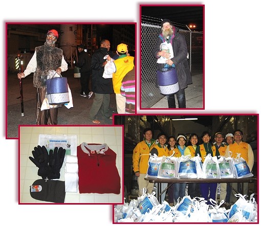 기후변화의 영향으로 올해 샌프란시스코는 그 어느 때보다 추웠다. 황금시대 4년(2007년) 12월 20일, 샌프란시스코 센터 사형사저들은 재빨리 겨울 옷을 구입해 거리의 노숙자들에게 전달했다. 우리는 백 개의 선물 꾸러미를 전달했는데, 꾸러미마다 침낭·장갑·양말·겨울 모자·채식 라면 1박스가 들어 있었다. 이 외에도 몇십 벌의 스웨터도 나누어 주었다. 이 선물은 길거리의 불우한 사람들에게 기쁨과 위로를 가져다주었다. 행사에 참여한 사형사저들은 사랑과 열의를 다해 임무를 완수했다. 전능하신 덕분에 날씨까지 우리를 도와주었다. 며칠간 밤에 비가 내렸었는데 그날 밤에는 비가 안 와서 절실히 필요한 이 선물들을 무사히 전달할 수 있었다. 다른 사람들에게 봉사하고 그들의 마음에 온정과 기쁨을 가져다줄 기회를 주신 스승님께 감사드린다.