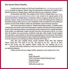 황금시대 4년(2007년) 12월 16일, 오리건 센터 동수들은 한 지역 보호소에 임시로 거주하고 있는 사람들에게 크리스마스 점심을 제공했다. 우리는 가정 학대를 피해 온 이들 여성과 아이들에게, 동수가 운영하는 음식점 ‘스위트 레몬 비스트로(Sweet Lemon Bistro)’에서 점심 식사를 하도록 정중히 초대했다. 동수들은 그들에게 정식 오찬을 대접하고 깜짝 크리스마스 선물을 하는가 하면 각자에게 돈을 나누어 주기도 했다. 또한 스승님의 아름다운 책인 『사랑스런 내 인생의 새들』 과 『사랑스런 내 인생의 개들』도 보호소에 기증했다. 이 행사는 보호소에 거주하는 사람들뿐만 아니라 직원들에게도 매우 특별한 일이었다. ‘욜란다의 집(Yolanda House)’ 보호소의 셀리 마사렐로(Shelly Massavello) 소장은 스승님께 매우 감동적인 이메일을 보냈다. “......보호소의 모든 거주자와 자원 봉사자들은 진심 어린 사랑과 온정, 존중의 마음으로 왕과 같은 대접을 받았고...... 어떤 사람들은 말문을 잃었으며 어떤 사람들은 기대하지도 않았던 마음의 선물을 받고 울음을 터뜨렸습니다. 아이들은 선물을 받고 좋아했고, 환상적인 점심을 좋아했고, 중요한 손님처럼 대접받아서 좋아했습니다. 자원 봉사자들까지도 ‘수프림 마스터 텔레비전’ 가방을 받았습니다. ......여러분은 정말 학대를 피해 온 우리 생존자들의 삶에 변화를 가져다주었으며 직원들과 자원 봉사자들의 마음을 감동시켰습니다.”