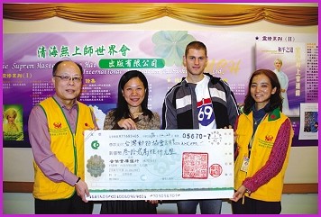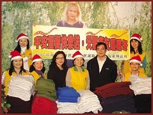 크리스마스가 다가오자 타이베이 동수들은 특별히 보온 바지 300벌을 구입해 황금시대 4년(2007년) 12월 24일, 타이베이 현 사회국과 타이베이 현 자원봉사협회의 ‘노숙자의 집’에 위탁해 거리의 친구들에게 나누어 주도록 했다. 사회국 구호·보조과의 린웨이슝(林偉雄) 과장과 자원 봉사협회의 황메이잉(黃梅英) 주임이 참석한 가운데 ‘사랑의 바다 문예광장’에서 조촐한 기증식이 열렸다. 린 과장은 크리스마스이브에 옷을 기증해 준 덕분에 노숙자 야간 탐방 계획이 순조롭게 진행되게 되었다면서 스승님과 국제협회의 관심에 무척 고마워했다. 또 우리는 오랜 세월 동안 노숙자들을 돌보아 온 이 숭고한 두 사람에게 스승님의 출판물과 『삶과 의식에 관한 사색』 , ‘대안적인 삶’ 서류 폴더, ‘수프림 마스터 텔레비전’ 광고 볼펜 등도 선물했다.