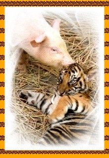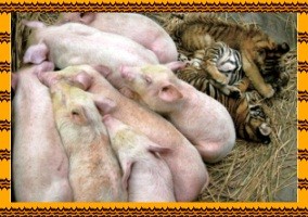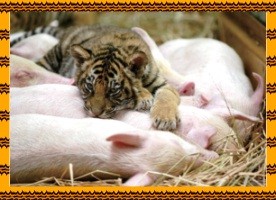 At the Xiangjiang Safari Park in Guangdong Province live three Bengal tiger cubs. It was the first-time for their mother to give birth to offspring. Due to inexperience, the tigress abandoned them soon after they were born. Desperately the park officials tried many ways to get them to eat, including bottle feeding. But the cubs were slow to adapt, and lost their weight after a few days due to starvation. Finally, the park officials got an inspiration: "This is the Year of the Pig. Why don't we get a female pig and see if she could raise the cubs?" So, they bought a pig mother who had just given birth. As soon as the pig mother arrived, the tiger cubs crawled to her for breast feeding. The pig mother did not refuse, and happily accepted the three little tigers as her own. Now the three tiger cubs look strong